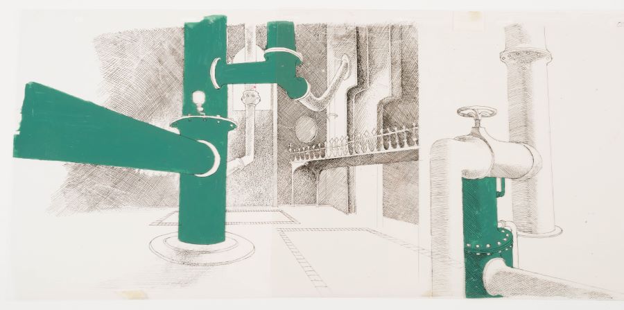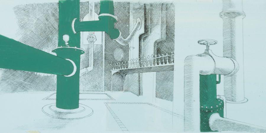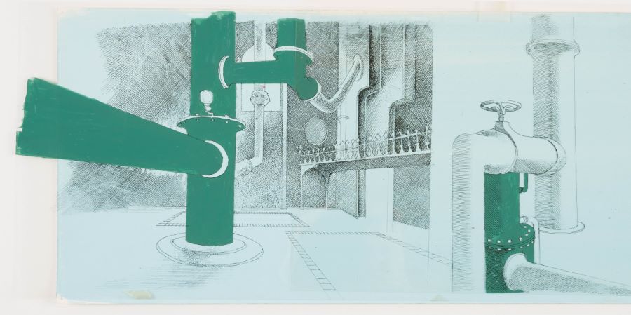 A unique development background for a film adaptation of “The Young Visiters.” Featuring a multilayered boiler room illustration by renowned background, the background was acquired in a collection with documentation including character names and dialogue. We have little information on the project but assume that the background was part of that production. Measuring 10.5"x36.5" overall, with the image area measuring 10"x23", the background is good condition with minor edge and handling wear due to age and studio use.